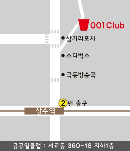 3) 지방에서 버스대절로 오실 경우 클럽입구까지 들어오는 골목이 좁아 버스가 회차하지 못하실 수 있으니 반드시 큰길에서 하차하셔서 오셔야 합니다. 참고로 네이버맵이나 카카오 맵에서 거리뷰로 클럽까지 들어오는 길을 한번 보시는걸 추천합니다. 공공일 클럽 주소 : 서울시 마포구 서교동 360-18
